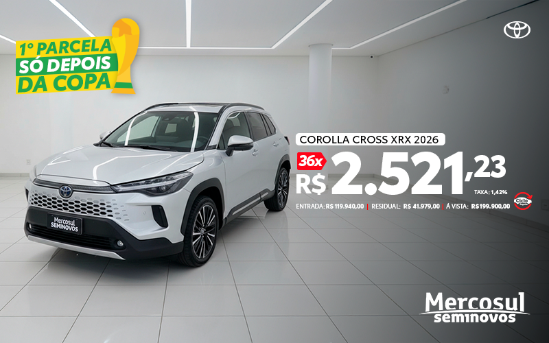 O texto gerado é específico para esta simulação. TOYOTA COROLLA CROSS XRX 2.0 16V FLEX AUT. Usado 2026 R$ 199.900,00 à vista ou financiado com o Banco Toyota no programa Ciclo Toyota nas seguintes condições: CDC (Crédito Direto ao Consumidor), pessoa física, com entrada de R$ 119.940,00 (60%) e 36 Prestações mensais fixas de R$ 2.521,23 mais 1 prestação residual no valor de R$ 41.979,00 (21%), com vencimento na mesma data da última prestação fixa do financiamento. Primeira prestação fixa com vencimento para 30/08/2026 ( APÓS A COPA). Taxa de juros pré-fixada de 1,42% ao mês, equivalente a 18,49% ao ano + IOF (Imposto sobre Operações Financeiras) no valor de R$ 2.877,24 + SPF (Seguro Proteção Financeira) no valor de R$ 4.430,36 + Registro de contrato base Estado SANTA CATARINA no valor de R$ 281,66 + Cesta de Serviços sugerida base Estado SANTA CATARINA no valor de R$ 550,00 + Tarifa de Confecção de Cadastro para início de Relacionamento no valor de R$ 1.200,00 + TARIFA DE AVALIAÇÃO DO BEM no valor de R$ 600,00 + Seguro Franquia no valor de R$ 1.000,00 inclusos no Total Financiado (GRATUITO PARA O CLIENTE NO PRIMEIRO ANO) correspondente a R$ 90.899,26. Valor Total a prazo de R$ 252.683,23. Custo Efetivo Total (CET) de 21,63% ao ano. O atraso no pagamento acarretará na incidência de multa e juros de mora na forma das cláusulas de financiamento conforme disponível no site www.bancotoyota.com.br. Liquidação antecipada não onerosa aplicável. Crédito sujeito à análise e aprovação. O CET apresentado é aplicável ao exemplo sugerido. Para os demais Estados consulte valores de Registro de Contrato e Cesta de Serviços e efetue nova simulação na concessionária Toyota. Campanha vinculada à validade do Programa Ciclo Toyota. Condições sujeitas à alteração sem prévio aviso. A alteração do modelo do veículo ou de qualquer das condições do financiamento acarretará novo cálculo do CET. Oferta válida até 30/04/2026. SAC Banco Toyota 0800 016 4155 ou envie um e-mail para [email protected]. Ouvidoria Banco Toyota (somente após atendimento pelo SAC): 0800-772-5877. Banco Toyota do Brasil S.A., Av. Jornalista Roberto Marinho, 85, 3º andar/SP-SP, www.bancotoyota.com.br. Pelo programa Ciclo Toyota, ao término do financiamento, a Toyota poderá realizar a recompra do veículo Toyota por 80% do valor da tabela FIPE: o valor poderá quitar a parcela residual e poderá ser utilizado como entrada para um Toyota 0Km. O nome "SPF PLUS" é utilizado na oferta de seguros aos clientes Toyota, seguro que oferece as coberturas de morte, invalidez permanente total por acidente, desemprego (profissional regido pela CLT, com no mínimo um ano de vínculo, 31 dias de carência e franquia) e incapacidade física total temporária (profissional autônomo, 31 dias de carência e 15 dias de franquia). O presente material possui informações resumidas, para conhecimento completo das coberturas oferecidas e suas restrições, recomendamos a leitura das Condições Gerais do Seguro disponibilizada no site ou fale com de nossos atendentes. Seguro garantido pela Seguradora Cardif do Brasil Vida e Previdência S/A, CNPJ: 03.564.261/0001-08, Processo Susep Nº 15414.901242 /2019-46, Estipulantes: Banco Toyota do Brasil S.A. - CNPJ: 03.215.790/0001-10. Corretor de Seguros: AON Affinity do Brasil Serviços e Corretora de Seguros LTDA. - CNPJ: 02.143.320/0001-26, Registro SUSEP Nº 202039378. "O registro deste plano na SUSEP não implica, por parte da Autarquia, incentivo ou recomendação a sua comercialização." Seguro Franquia - Processo SUSEP: 15414.900949/2017-73, Seguradora: Cardif do Brasil Seguros e Garantias S/A – CNPJ: 08.279.191/0001-84. O Seguro Toyota é administrado pela Toyota Corretora de Seguros do Brasil Ltda, CNPJ: 48.124.029/0001-01 e Registro SUSEP nº 222140362. A contratação de seguro é opcional, sendo possível a desistência do contrato em até 7 (sete) dias corridos com a devolução integral do valor pago. É proibido condicionar desconto no preço do bem à aquisição do seguro. A comercialização de seguros é fiscalizada pela SUSEP www.susep.gov.br - 0800 021 8484. O registro do produto é automático e não representa aprovação ou recomendação por parte da Susep. É dever do intermediário disponibilizar ao cliente formal e previamente à contratação do seguro, o montante de sua remuneração e o prêmio do seguro. É dever do intermediário informar ao cliente, formal e previamente à contratação do seguro, se atua com exclusividade para uma ou mais seguradoras, divulgando os nomes das seguradoras para os quais atua como intermediário, caso não haja contrato de exclusividade. Saiba mais sobre a privacidade dos seus dados pessoais e como serão mantidos em segurança: acesse: LEI GERAL DE PROTEÇÃO DE DADOS (bnpparibascardif.com.br)