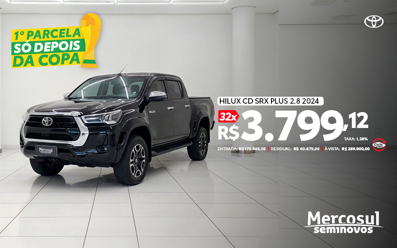 O texto gerado é específico para esta simulação. TOYOTA HILUX CD SRX PLUS 4X4 2.8 TDI DIE. AUT. Usado 2024 R$ 289.900,00 à vista ou financiado com o Banco Toyota no programa Ciclo Toyota nas seguintes condições: CDC (Crédito Direto ao Consumidor), pessoa física, com entrada de R$ 173.940,00 (60%) e 32 Prestações mensais fixas de R$ 3.799,12 mais 1 prestação residual no valor de R$ 60.879,00 (21%), com vencimento na mesma data da última prestação fixa do financiamento. Primeira prestação fixa com vencimento para 30/08/2026 (APÓS A COPA) Taxa de juros pré-fixada de 1,38% ao mês, equivalente a 17,91% ao ano + IOF (Imposto sobre Operações Financeiras) no valor de R$ 4.102,75 + SPF (Seguro Proteção Financeira) no valor de R$ 6.338,36 + Registro de contrato base Estado SANTA CATARINA no valor de R$ 281,66 + Cesta de Serviços sugerida base Estado SANTA CATARINA no valor de R$ 550,00 + Tarifa de Confecção de Cadastro para início de Relacionamento no valor de R$ 1.200,00 + TARIFA DE AVALIAÇÃO DO BEM no valor de R$ 600,00 + Seguro Franquia no valor de R$ 1.000,00 inclusos no Total Financiado (GRATUITO PARA O CLIENTE NO PRIMEIRO ANO) correspondente a R$ 130.032,77. Valor Total a prazo de R$ 356.390,82. Custo Efetivo Total (CET) de 20,85% ao ano. O atraso no pagamento acarretará na incidência de multa e juros de mora na forma das cláusulas de financiamento conforme disponível no site www.bancotoyota.com.br. Liquidação antecipada não onerosa aplicável. Crédito sujeito à análise e aprovação. O CET apresentado é aplicável ao exemplo sugerido. Para os demais Estados consulte valores de Registro de Contrato e Cesta de Serviços e efetue nova simulação na concessionária Toyota. Campanha vinculada à validade do Programa Ciclo Toyota. Condições sujeitas à alteração sem prévio aviso. A alteração do modelo do veículo ou de qualquer das condições do financiamento acarretará novo cálculo do CET. Oferta válida até 30/04/2026. SAC Banco Toyota 0800 016 4155 ou envie um e-mail para [email protected]. Ouvidoria Banco Toyota (somente após atendimento pelo SAC): 0800-772-5877. Banco Toyota do Brasil S.A., Av. Jornalista Roberto Marinho, 85, 3º andar/SP-SP, www.bancotoyota.com.br. Pelo programa Ciclo Toyota, ao término do financiamento, a Toyota poderá realizar a recompra do veículo Toyota por 80% do valor da tabela FIPE: o valor poderá quitar a parcela residual e poderá ser utilizado como entrada para um Toyota 0Km. O nome "SPF PLUS" é utilizado na oferta de seguros aos clientes Toyota, seguro que oferece as coberturas de morte, invalidez permanente total por acidente, desemprego (profissional regido pela CLT, com no mínimo um ano de vínculo, 31 dias de carência e franquia) e incapacidade física total temporária (profissional autônomo, 31 dias de carência e 15 dias de franquia). O presente material possui informações resumidas, para conhecimento completo das coberturas oferecidas e suas restrições, recomendamos a leitura das Condições Gerais do Seguro disponibilizada no site ou fale com de nossos atendentes. Seguro garantido pela Seguradora Cardif do Brasil Vida e Previdência S/A, CNPJ: 03.564.261/0001-08, Processo Susep Nº 15414.901242 /2019-46, Estipulantes: Banco Toyota do Brasil S.A. - CNPJ: 03.215.790/0001-10. Corretor de Seguros: AON Affinity do Brasil Serviços e Corretora de Seguros LTDA. - CNPJ: 02.143.320/0001-26, Registro SUSEP Nº 202039378. "O registro deste plano na SUSEP não implica, por parte da Autarquia, incentivo ou recomendação a sua comercialização." Seguro Franquia - Processo SUSEP: 15414.900949/2017-73, Seguradora: Cardif do Brasil Seguros e Garantias S/A – CNPJ: 08.279.191/0001-84. O Seguro Toyota é administrado pela Toyota Corretora de Seguros do Brasil Ltda, CNPJ: 48.124.029/0001-01 e Registro SUSEP nº 222140362. A contratação de seguro é opcional, sendo possível a desistência do contrato em até 7 (sete) dias corridos com a devolução integral do valor pago. É proibido condicionar desconto no preço do bem à aquisição do seguro. A comercialização de seguros é fiscalizada pela SUSEP www.susep.gov.br - 0800 021 8484. O registro do produto é automático e não representa aprovação ou recomendação por parte da Susep. É dever do intermediário disponibilizar ao cliente formal e previamente à contratação do seguro, o montante de sua remuneração e o prêmio do seguro. É dever do intermediário informar ao cliente, formal e previamente à contratação do seguro, se atua com exclusividade para uma ou mais seguradoras, divulgando os nomes das seguradoras para os quais atua como intermediário, caso não haja contrato de exclusividade. Saiba mais sobre a privacidade dos seus dados pessoais e como serão mantidos em segurança: acesse: LEI GERAL DE PROTEÇÃO DE DADOS (bnpparibascardif.com.br)