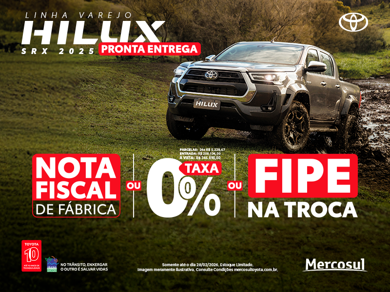 Hilux Cabine Dupla SRX AT 0 Km de cor Branco Polar (040) à vista R$ 346.890,00 ou financiado com o Banco Toyota no programa Ciclo Toyota nas seguintes condições: CDC (Crédito Direto ao Consumidor), pessoa física, com entrada de R$ 208.134,00 (60%) e 24 prestações fixas de R$ 5.228,67, mais 1 prestação residual no valor de R$ 69.378,00, com vencimento na mesma data da última prestação fixa do financiamento. Primeira prestação fixa com vencimento para 30 dias do fechamento do financiamento. Taxa de juros pré-fixada de 1.73% ao mês, equivalente a 22.89% ao ano + IOF (Imposto sobre Operações Financeiras) no valor de R$ 4.165,45 + Registro de contrato base Brasília no valor de R$ 950,00 + Cesta de Serviços sugerida base Brasília de no valor de R$ 550,00 + Tarifa de Confecção de Cadastro para início de Relacionamento no valor de R$ 550,00 inclusos no Total Financiado correspondente a R$ 147.893,66 Valor Total à prazo de R$ 403.000,04. Custo Efetivo Total (CET) de 27.11% ao ano. O atraso no pagamento acarretará na incidência de multa e juros de mora na forma das cláusulas de financiamento conforme disponível no site www.bancotoyota.com.br. Liquidação antecipada não onerosa aplicável. Crédito sujeito à análise e aprovação. O CET apresentado é aplicável ao exemplo sugerido. Para os demais Estados consulte valores de Registro de Contrato e Cesta de Serviços e efetue nova simulação na concessionária Toyota. Campanha vinculada à validade do Programa Ciclo Toyota. Condições sujeitas à alteração sem prévio aviso. A alteração do modelo do veículo ou de qualquer das condições do financiamento acarretará novo cálculo do CET. SAC Banco Toyota 0800 016 4155 ou envie um e-mail para [email protected]. Ouvidoria Banco Toyota (somente após atendimento pelo SAC): 0800-772-5877. Pelo programa Ciclo Toyota, ao término do financiamento, a Toyota poderá realizar a recompra do veículo Toyota por 80% do valor da tabela FIPE: o valor poderá quitar a parcela residual e poderá ser utilizado como entrada para um Toyota 0Km.