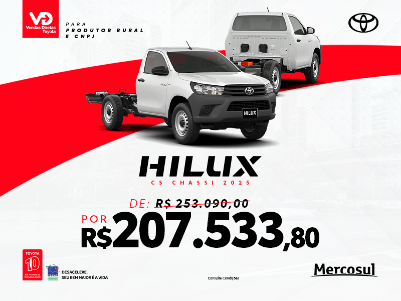 Hilux Cabine Simples Chassi MT 0 Km de cor Branco Polar (040) de R$ 253.090,00 por: R$ 207.533,80 . Oferta válida apenas para veículos faturados entre 01 e 30 de Outubro de 2025 à Produtor rural e CNPJ que adquirirem veículos Toyota por venda direta, com pagamento à vista na rede de Distribuidores Toyota dos Estados de SP, MG, ES, RJ, PR, SC, RS, DF, AC, AL, AP, AM, BA, CE, GO, MA, MT, MS, PA, PB, PE, PI, RN, RO, RR, SE e TO. Consulte uma concessionária Toyota para preços e condições em caso de financiamento pelo Banco Toyota. É imprescindível a apresentação da documentação original da isenção (para condição de isenção de impostos) e o porte do alvará de licença devidamente regulamentado e dentro do prazo de validade. Consulte as regras do programa para venda a clientes taxistas junto à um Concessionário autorizado Toyota SAC Banco Toyota 0800 016 4155 ou envie um e-mail para [email protected]. Ouvidoria Banco Toyota (somente após atendimento pelo SAC): 0800-772-5877. Banco Toyota do Brasil S.A., Av. Jornalista Roberto Marinho, 85, 3º andar/SP-SP, www.bancotoyota.com.br. A Toyota garante seus veículos em condições normais de utilização contra defeitos de fabricação de peças ou de montagem, desde que todas as manutenções (preventivas, corretivas e emergenciais) sejam em concessionárias autorizada Toyota, por um período total de cobertura básica de 60 (sessenta) meses, contados a partir da data de entrega do veículo zero-quilômetro, tendo por destinatário o primeiro proprietário. Nesses casos, a garantia ficará limitada ao período de 60 (sessenta) meses ou 100.000 km (cem mil quilômetros), prevalecendo o que primeiro ocorrer. Oferta válida apenas para as condições especificadas. Esta promoção não é cumulativa com outras promoções vigentes ou condições/ofertas especiais. As condições acima se aplicam somente para vendas diretas. A presente campanha é uma ação exclusiva das concessionárias Toyota, para mais informações e planos disponíveis, consulte um concessionário Toyota.