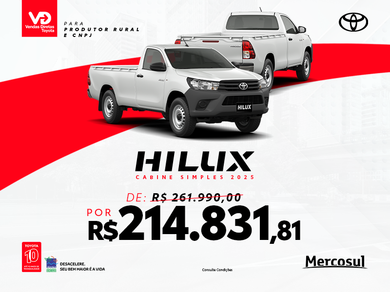 Hilux Cabine Simples MT 0 Km de cor Branco Polar (040) de R$ 261.990,00 por: R$ 214.831,81 . Oferta válida apenas para veículos faturados entre 01 e 31 de Outubro de 2025 à Produtor rural e CNPJ que adquirirem veículos Toyota por venda direta, com pagamento à vista na rede de Distribuidores Toyota dos Estados de SP, MG, ES, RJ, PR, SC, RS, DF, AC, AL, AP, AM, BA, CE, GO, MA, MT, MS, PA, PB, PE, PI, RN, RO, RR, SE e TO. Consulte uma concessionária Toyota para preços e condições em caso de financiamento pelo Banco Toyota. É imprescindível a apresentação da documentação original da isenção (para condição de isenção de impostos) e o porte do alvará de licença devidamente regulamentado e dentro do prazo de validade. Consulte as regras do programa para venda a clientes taxistas junto à um Concessionário autorizado Toyota SAC Banco Toyota 0800 016 4155 ou envie um e-mail para [email protected]. Ouvidoria Banco Toyota (somente após atendimento pelo SAC): 0800-772-5877. Banco Toyota do Brasil S.A., Av. Jornalista Roberto Marinho, 85, 3º andar/SP-SP, www.bancotoyota.com.br. A Toyota garante seus veículos em condições normais de utilização contra defeitos de fabricação de peças ou de montagem, desde que todas as manutenções (preventivas, corretivas e emergenciais) sejam em concessionárias autorizada Toyota, por um período total de cobertura básica de 60 (sessenta) meses, contados a partir da data de entrega do veículo zero-quilômetro, tendo por destinatário o primeiro proprietário. Nesses casos, a garantia ficará limitada ao período de 60 (sessenta) meses ou 100.000 km (cem mil quilômetros), prevalecendo o que primeiro ocorrer. Oferta válida apenas para as condições especificadas. Esta promoção não é cumulativa com outras promoções vigentes ou condições/ofertas especiais. As condições acima se aplicam somente para vendas diretas. A presente campanha é uma ação exclusiva das concessionárias Toyota, para mais informações e planos disponíveis, consulte um concessionário Toyota.