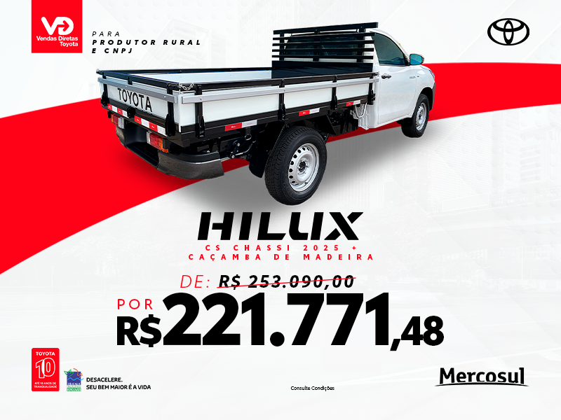 Hilux Cabine Simples Chassi MT + Caçamba de Madeira 0 Km de cor Branco Polar (040) de R$ 253.090,00 por: R$ 221.771,48 (Valor com Desconto de 18% R$ 207.533,80 + Caçamba de Madeira R$ 14.237,68). Oferta válida apenas para veículos faturados entre 01 e 30 de Outubro de 2025 à Produtor rural e CNPJ que adquirirem veículos Toyota por venda direta, com pagamento à vista na rede de Distribuidores Toyota dos Estados de SP, MG, ES, RJ, PR, SC, RS, DF, AC, AL, AP, AM, BA, CE, GO, MA, MT, MS, PA, PB, PE, PI, RN, RO, RR, SE e TO. Consulte uma concessionária Toyota para preços e condições em caso de financiamento pelo Banco Toyota. É imprescindível a apresentação da documentação original da isenção (para condição de isenção de impostos) e o porte do alvará de licença devidamente regulamentado e dentro do prazo de validade. Consulte as regras do programa para venda a clientes taxistas junto à um Concessionário autorizado Toyota SAC Banco Toyota 0800 016 4155 ou envie um e-mail para [email protected]. Ouvidoria Banco Toyota (somente após atendimento pelo SAC): 0800-772-5877. Banco Toyota do Brasil S.A., Av. Jornalista Roberto Marinho, 85, 3º andar/SP-SP, www.bancotoyota.com.br. A Toyota garante seus veículos em condições normais de utilização contra defeitos de fabricação de peças ou de montagem, desde que todas as manutenções (preventivas, corretivas e emergenciais) sejam em concessionárias autorizada Toyota, por um período total de cobertura básica de 60 (sessenta) meses, contados a partir da data de entrega do veículo zero-quilômetro, tendo por destinatário o primeiro proprietário. Nesses casos, a garantia ficará limitada ao período de 60 (sessenta) meses ou 100.000 km (cem mil quilômetros), prevalecendo o que primeiro ocorrer. Oferta válida apenas para as condições especificadas. Esta promoção não é cumulativa com outras promoções vigentes ou condições/ofertas especiais. As condições acima se aplicam somente para vendas diretas. A presente campanha é uma ação exclusiva das concessionárias Toyota, para mais informações e planos disponíveis, consulte um concessionário Toyota.