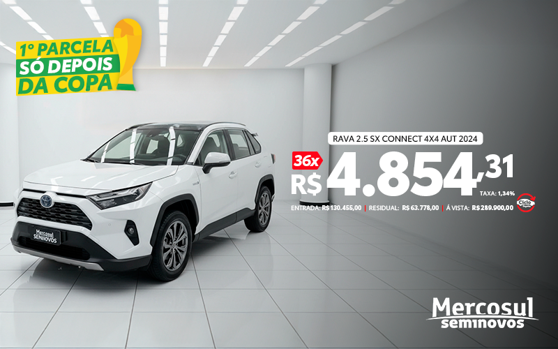 O texto gerado é específico para esta simulação. TOYOTA RAV4 2.5 SX CONNECT 4X4 AUT. (H?BRIDO) Usado 2024 R$ 289.900,00 à vista ou financiado com o Banco Toyota no programa Ciclo Toyota nas seguintes condições: CDC (Crédito Direto ao Consumidor), pessoa física, com entrada de R$ 130.455,00 (45%) e 36 Prestações mensais fixas de R$ 4.854,31 mais 1 prestação residual no valor de R$ 63.778,00 (22%), com vencimento na mesma data da última prestação fixa do financiamento. Primeira prestação fixa com vencimento para 30/07/2026 (APÓS A COPA) Taxa de juros pré-fixada de 1,34% ao mês, equivalente a 17,39% ao ano + IOF (Imposto sobre Operações Financeiras) no valor de R$ 5.298,27 + SVP (Seguro Vida Prestamista) no valor de R$ 3.412,01 + Registro de contrato base Estado SANTA CATARINA no valor de R$ 281,66 + Cesta de Serviços sugerida base Estado SANTA CATARINA no valor de R$ 550,00 + Tarifa de Confecção de Cadastro para início de Relacionamento no valor de R$ 1.200,00 + Seguro Franquia no valor de R$ 1.000,00 inclusos no Total Financiado ( GRATUITO PARA O CLIENTE NO PRIMEIRO ANO) correspondente a R$ 171.186,94. Valor Total a prazo de R$ 368.988,08. Custo Efetivo Total (CET) de 20,03% ao ano. O atraso no pagamento acarretará na incidência de multa e juros de mora na forma das cláusulas de financiamento conforme disponível no site www.bancotoyota.com.br. Liquidação antecipada não onerosa aplicável. Crédito sujeito à análise e aprovação. O CET apresentado é aplicável ao exemplo sugerido. Para os demais Estados consulte valores de Registro de Contrato e Cesta de Serviços e efetue nova simulação na concessionária Toyota. Campanha vinculada à validade do Programa Ciclo Toyota. Condições sujeitas à alteração sem prévio aviso. A alteração do modelo do veículo ou de qualquer das condições do financiamento acarretará novo cálculo do CET. Oferta válida até 20/04/2026. SAC Banco Toyota 0800 016 4155 ou envie um e-mail para [email protected]. Ouvidoria Banco Toyota (somente após atendimento pelo SAC): 0800-772-5877. Banco Toyota do Brasil S.A., Av. Jornalista Roberto Marinho, 85, 3º andar/SP-SP, www.bancotoyota.com.br. Pelo programa Ciclo Toyota, ao término do financiamento, a Toyota poderá realizar a recompra do veículo Toyota por 80% do valor da tabela FIPE: o valor poderá quitar a parcela residual e poderá ser utilizado como entrada para um Toyota 0Km. O nome "SVP" é utilizado na oferta de seguros aos clientes Toyota, seguro que oferece as coberturas de morte ou invalidez permanente total por acidente. O presente material possui informações resumidas, para conhecimento completo das coberturas oferecidas e suas restrições, recomendamos a leitura das Condições Gerais do Seguro disponibilizada no site ou fale com de nossos atendentes. Seguro garantido pela Seguradora Cardif do Brasil Vida e Previdência S/A, CNPJ: 03.564.261/0001-08, Processo Susep Nº 15414.901242/2019-46, Estipulantes: Banco Toyota do Brasil S.A. - CNPJ: 03.215.790/0001-10. Corretor de Seguros: AON Affinity do Brasil Serviços e Corretora de Seguros LTDA. - CNPJ: 02.143.320/0001-26, Registro SUSEP Nº 202039378. "O registro deste plano na SUSEP não implica, por parte da Autarquia, incentivo ou recomendação a sua comercialização." Seguro Franquia - Processo SUSEP: 15414.900949/2017-73, Seguradora: Cardif do Brasil Seguros e Garantias S/A – CNPJ: 08.279.191/0001-84. O Seguro Toyota é administrado pela Toyota Corretora de Seguros do Brasil Ltda, CNPJ: 48.124.029/0001-01 e Registro SUSEP nº 222140362. A contratação de seguro é opcional, sendo possível a desistência do contrato em até 7 (sete) dias corridos com a devolução integral do valor pago. É proibido condicionar desconto no preço do bem à aquisição do seguro. A comercialização de seguros é fiscalizada pela SUSEP www.susep.gov.br - 0800 021 8484. O registro do produto é automático e não representa aprovação ou recomendação por parte da Susep. É dever do intermediário disponibilizar ao cliente formal e previamente à contratação do seguro, o montante de sua remuneração e o prêmio do seguro. É dever do intermediário informar ao cliente, formal e previamente à contratação do seguro, se atua com exclusividade para uma ou mais seguradoras, divulgando os nomes das seguradoras para os quais atua como intermediário, caso não haja contrato de exclusividade. Saiba mais sobre a privacidade dos seus dados pessoais e como serão mantidos em segurança: acesse: LEI GERAL DE PROTEÇÃO DE DADOS (bnpparibascardif.com.br)